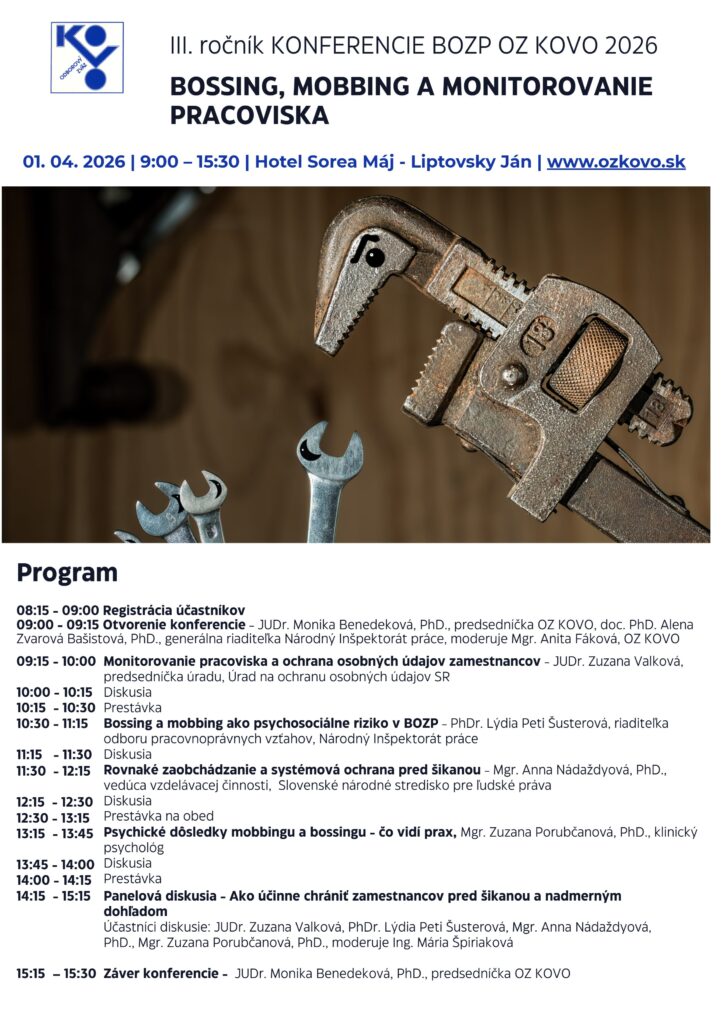 Už 1. apríla vás radi privítame v priestoroch Hotela Máj v Liptovskom Jáne na odbornej konferencii, venovanej aktuálnej téme bossingu, mobbingu a monitorovania pracoviska a zameranej na ochranu dôstojnosti zamestnancov, prevenciu psychosociálnych rizík a právnych aspektov uvedeného neadekvátneho konania na pracovisku.
